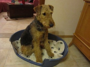 Zeg ‘es, ik mag hier ook niks! Het is toch voor mij? Aha, de doos gaat open! Er komt iets wit uit, en ook grijs en er staan hondenpootjes op. Ooooh, wat jammer, dat is niet om te eten! Dat ziet eruit als het andere dekentje in mijn mand. Zie je wel. Het andere dekentje gaat uit mijn mand en naar de ‘was’. Wie is dat hondje dat mijn deken krijgt? Mijn mand gaat toch niet ook naar ‘was’? Neen, blijkbaar niet. Nieuwe ding komt in mijn mand. Bah, dat stinkt! Eruit dat ding!