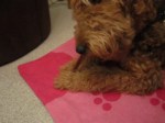 Het vrouwtje heeft mijn roze dekentje mee én… een kauwbeentje. Dan ben ik zoet! 🙂