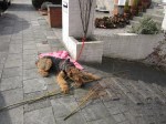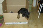 Wat ik dan gedaan heb? Me geamuseerd, meer niet! Ja, natuurlijk heb ik wel het rieten mandje van de hondenspeeltjes en kauwbenen stuk gebeten. Maar opa Lennox heeft dus geholpen, in zijn pels hingen ook stukken als bewijs! En andere honden hebben ook al andere mandjes stukgebeten… Het mandje moest maar steviger zijn… Ja, natuurlijk heb ik een pakje sigaretten te pakken gekregen en stukgebeten, dat was misschien niet zo slim… is niet zo gezond, want Luca, een ander logeervriendje moest ervan niezen… En ja, natuurlijk heb ik buiten in de sneeuw een plastieken bloempot gevonden en dat was een leuk kauwspeeltje, toch? Hoe het er nadien uit zag, heeft het vrouwtje gelukkig niet gezien…
