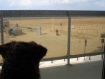 Wat zegt ze? Denkt ze dat ik eindelijk oud genoeg en getraind genoeg ben om te mogen los lopen op het strand? Goed geoefend in Frankrijk? Volgens het bord mag het hier… als we maar de goede kant uitgaan!