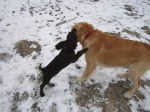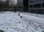 Gisteren speelde Loulou al mee in de sneeuw. Na een poosje kreeg Loulou-pup het koud en ging ze met haar vrouwtje naar huis.