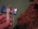 Oké guys, my collar is a bit of a success, says my mum. She says a foreign friend thinks I’m a red, low flying UFO! Waaauw! That’s me from today on: an UFO-airedale-lady! Waaaauw, wooofwaf, I’m proud of my collar!