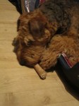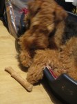 Wat zegt het vrouwtje? Sterk spul? Jaja, anderhalf uur om zo’n klein stukje er af te bijten! Leuk verjaardagscadeautje, zegt ze! Dat is weer geen hondentaal! Ik zal het toch niet moeten teruggeven? Ik bijt gewoon door! Haja! 😉